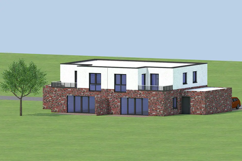 Alle Doppelhaushälften sind mit großzügigen Terrassen sowie Gartenanteilen und Dachterrassen ausgestattet. Durch die moderne Architektur werden diese Objekte zum Blickfang in Wierthe.