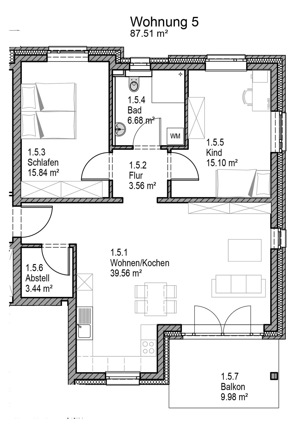 - Wohn-/Esszimmer, offene Küche, 2 Schlafzimmer, Badezimmer, Flur, Abstellraum, Balkon