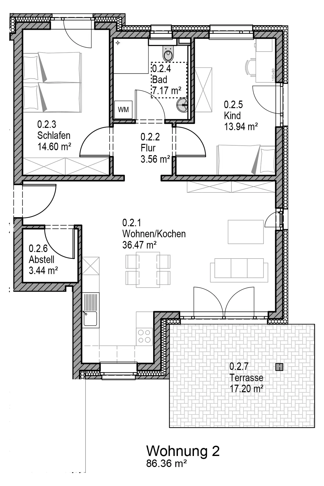- Wohn-/Esszimmer, offene Küche, 2 Schlafzimmer, Badezimmer, Flur, Abstellraum, Terrasse