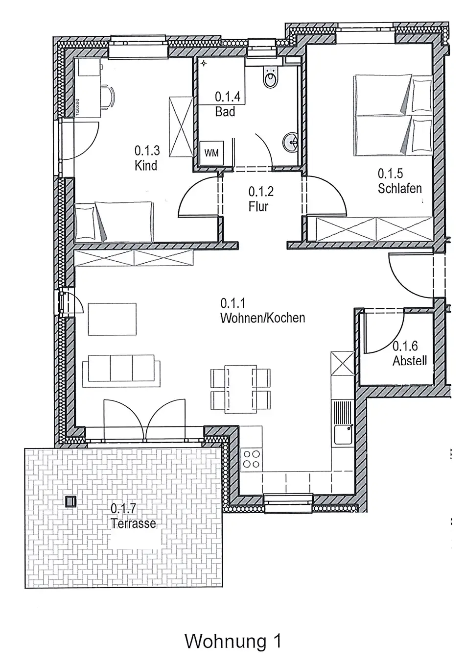 - Wohn-/Esszimmer, offene Küche, 1 Schlafzimmer, Badezimmer, Flur, Abstellraum, Terrasse